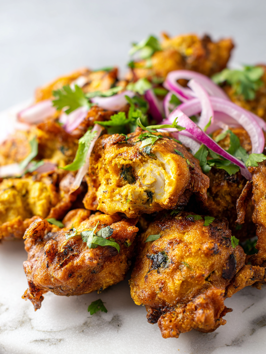 - Check doneness: The pakoras should be deep golden and crispy. The chicken inside should be firm but tender—juicy, not dry. If not, cook a bit longer.