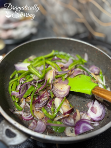- In the same pan, add more butter or oil, then sauté onions and sliced poblanos for 5 minutes. Add the minced garlic and cook for 30–60 seconds, just until fragrant.