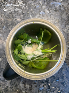 - Meanwhile, blend the cooked poblano peppers with cilantro, ¼ teaspoon salt, and ½ cup chicken stock until smooth.