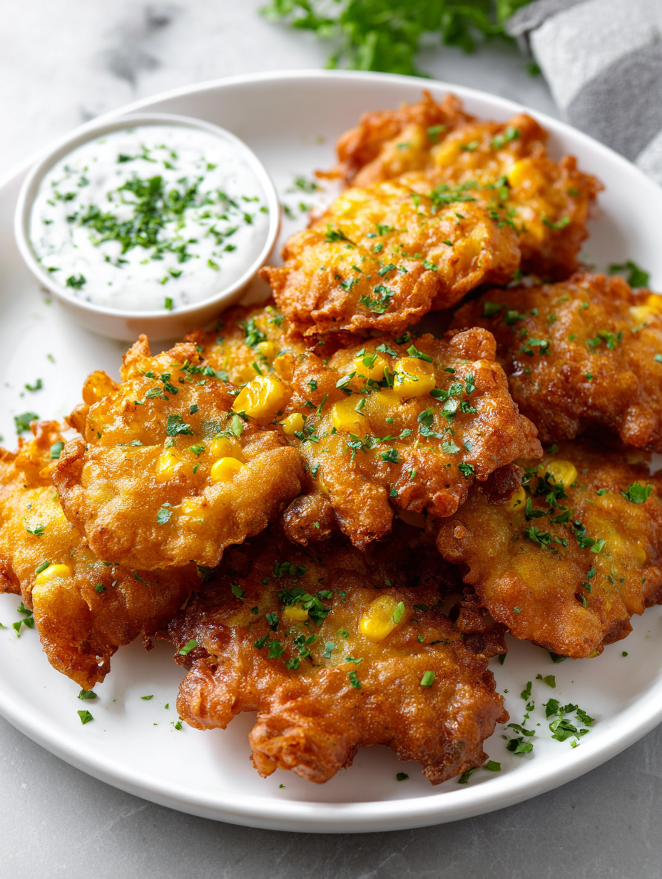 Serve fritters immediately while hot and crisp. Garnish with a sprinkle of sea salt or a squeeze of lemon for brightness. Rest for a minute on the plate to settle before serving for optimal crunch and flavor.