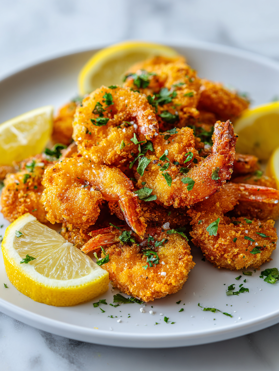 - Squeeze fresh lemon juice over the crispy shrimp for brightness. Serve immediately while still hot and crunchy, garnished with additional lemon wedges if desired.